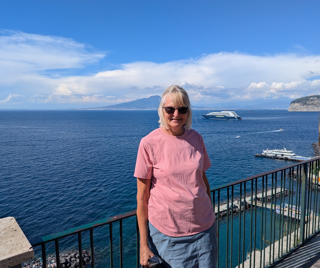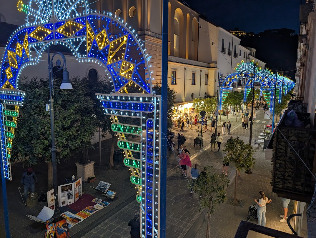 We arrived in Sorrento in the early afternoon and met our lodging host. When he let us inside, we were shocked! The apartment was fantastic. It was larger, newer, and had more amenities than our original booking. The host had left enough beverages and food to last a family of six to survive for at least two weeks. We also had a small balcony which overlooked Corso Italia. (Pictured below from our balcony) This is the main pedestrian street in Sorrento. What a great way to start our vacation in stunning Sorrento. Thank you VRBO for that last minute cancellation. From the Piazza della Vittoria, we had wonderful views of the Gulf of Naples and the Tyrrhenian Sea (which is adjacent to the Mediterranean Sea). The sunsets off this Piazza were breathtaking. The mountain in the background is the famous Mount Vesuvius. We were in paradise, but it would get better.