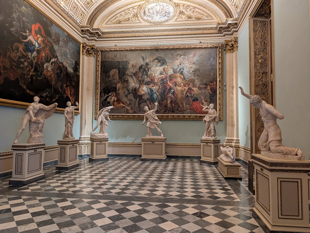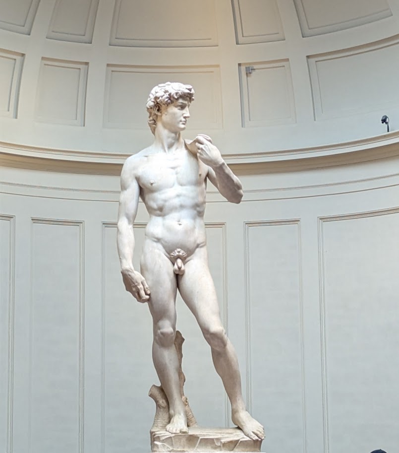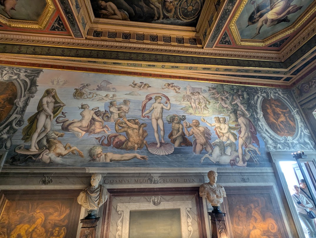 The Uffizi gallery is huge with multiple wings featuring famous artists such as Giotto, Rembrandt, Michelangelo, Raphael, and others. After the House of Medici died out, most of their art collections were donated to Florence. The Uffizi building was completed in 1581, and has hosted art collections since the 16th century. Art lovers could spend days in this heavenly artistic destination, but we were finished after about three and 1/2 hours. In the first hour, Uffizi was relatively easy to maneuver around, but the crowds increased every hour. After being spooked by the strange, but famous Medusa by Caravaggio, we departed the museum. To illustrate our level of art expertise, Amy dedicated this room as the “action-statues room”.
