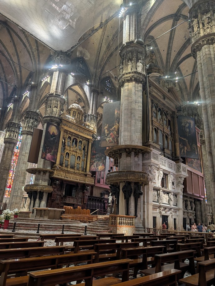 We have found extra benefits by purchasing online tickets at various European churches. These premium tickets allow visitors to access areas of the church that are not available to the general public. This normally includes terraces, rooftops, and other special exhibits. Since a majority of tourists are not as anal about detailed planning as this author, the premium access areas are more manageable in terms of quantity of persons. However, this wasn’t the case today at the Milan Duomo. While at the top with beautiful views of Milan, people were queued up the entire way. This Duomo is amazing, even with the masses. Construction started in the 14th century, and it wasn’t completely finished until 1965. The massive church is held together by 40 immense pillars, and the entire floor is made of marble. The high altar is from 313AD. There are 3400 statues, 135 gargoyles, 700 figures, and 135 ornate, Gothic spires.