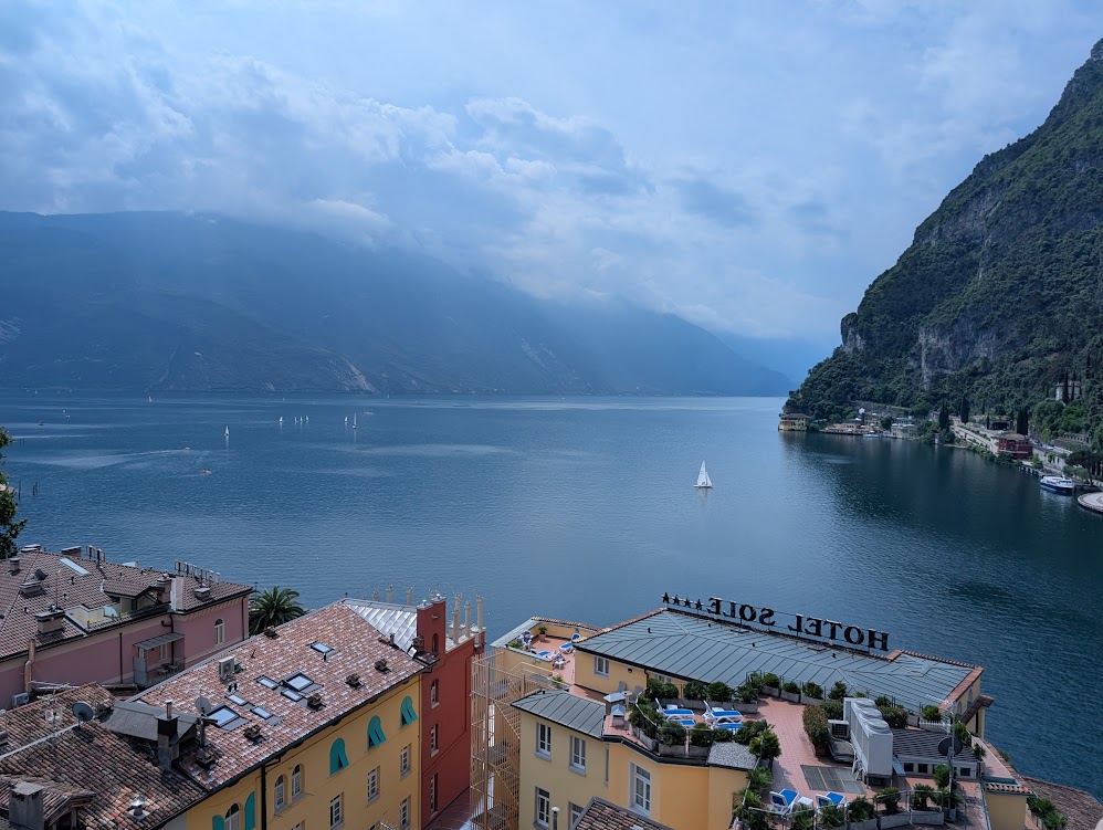 Riva has a beautiful lakeshore path which glides past a fortress, parks, flower beds and beaches. The stormy morning clouds quickly gave way to sunny skies. We also started to see windsurfers as we headed back into town from the lakeshore path. Before tennis, my sport passion was windsurfing. I started just as the sport started taking off in popularity. This was my main sporting activity for about 25 years. Since a bicycle crash demolished my left shoulder, I have not windsurf. This is because a lot of strength is required to lift the sail from under the water while treading water. This is required to perform what is called a water start. I would have loved to jump on a board on scenic Lake Garda, but it wasn’t going to happen.